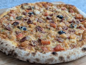 Tomate, Poulet, Poivrons, Emmental, Olives.